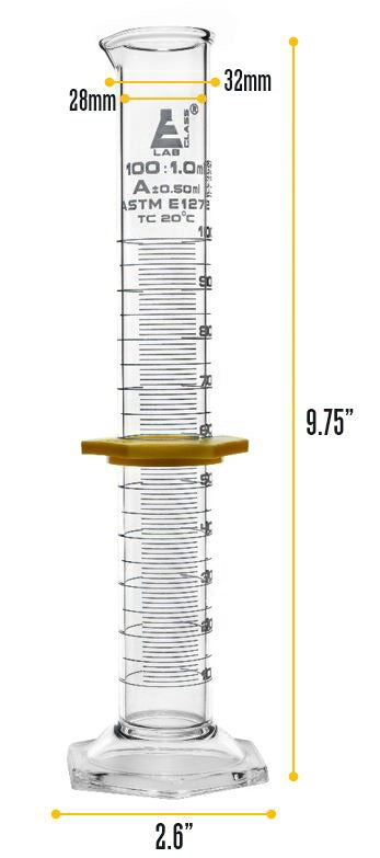 100ml capacity measuring cylinder made of high quality, heavy duty Borosilicate 3.3 glass. Spout for easy pouring, and hexagonal base for extra stability. Class A tolerance, ±0.50ml as per ISO/ASTM. Fitted with a plastic, hexagonal protective collar.Autoclavable, with superior chemical durability. Low temperature gradient- can withstand high temperatures & thermal shocks. Eisco Labs Borosilicate glass has the following heat tolerances: Strain Point -515°C | Annealing Point 565°C | Softening Point 820°C.