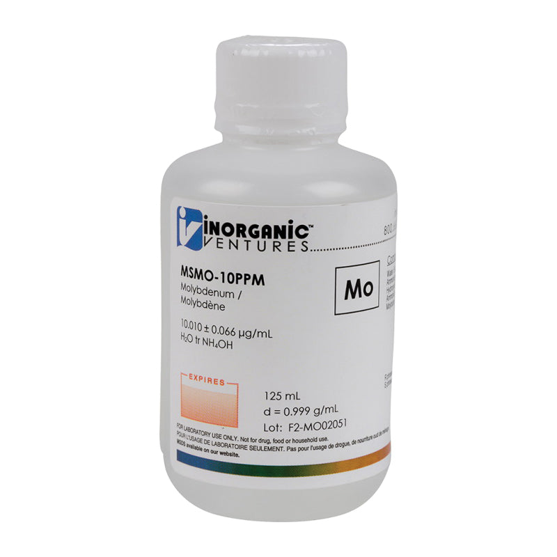 Inorganic Ventures' 10 ppm (µg/mL) Molybdenum for ICP-MS is a certified reference material set in a ammonium hydroxide matrix for stability. This molybdenum standard is Traceable to NIST and manufactured in accordance with Inorganic Ventures' stringent Quality Assurance guidelines.