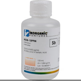 Inorganic Ventures' 10 ppm (µg/mL) Antimony for ICP-MS is a certified reference material set in a nitric acid / tartaric acid matrix for stability. This antimony standard is Traceable to NIST and manufactured in accordance with Inorganic Ventures' stringent Quality Assurance guidelines.