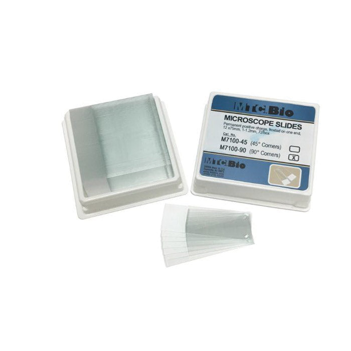 Microscope Slide, 25 x 75 mm, 1.1 mm Thick, Clear, Glass, 90 deg Corner Angle, Frosted on One End, Positive Charge That Makes the Surface Ideal for Cell, Tissue and General Sample Adhesion