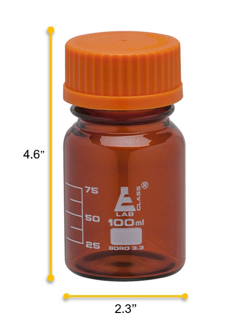100ml capacity reagent bottle made of high quality, amber colored Borosilicate 3.3 glass. Bottle features white, 12.5ml graduation lines that are marked every 25ml. As per DIN ISO 4796-1 standard. Equipped with an orange, GL 45 screw cap and features a drip free pouring ring for cleaner, safer transfers of liquids and powders. Both screw cap and pouring ring are autoclavable. Bottle features superior chemical durability and low temperature gradient - can withstand high temperatures & thermal shocks. Bottle stands 4.6" tall, with a base measuring 2.3" wide. Inner diameter of bottle mouth measures 1".