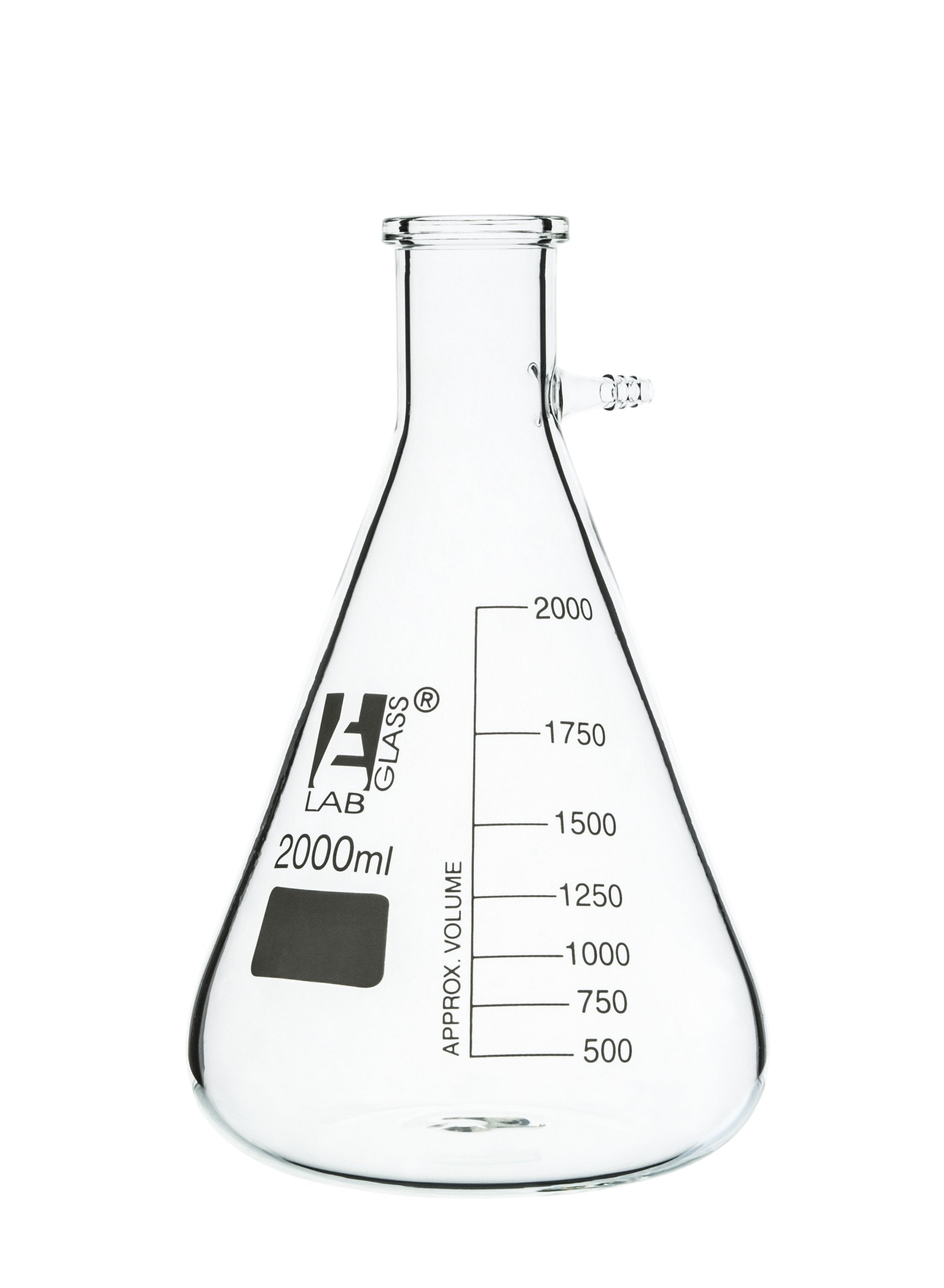 Conical filtering flask with integral side arm. 2000ml capacity with white graduations marked every 250ml. Flask measures 10.5" tall, and 7" in diameter. Neck diameter measures 1.5". Integral side arm measures 1.5" long and 0.25" in diameter.Autoclavable, with superior chemical durability. Low temperature gradient- can withstand high temperatures & thermal shocks. Eisco Labs Borosilicate glass has the following heat tolerances: Strain Point -515°C | Annealing Point 565°C | Softening Point 820°C.