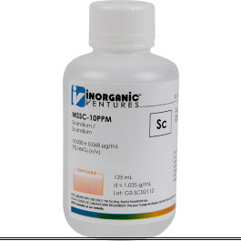 Inorganic Ventures' 10 ppm (µg/mL) Scandium for ICP-MS is a certified reference material set in a nitric acid matrix for stability. This scandium standard is Traceable to NIST and manufactured in accordance with Inorganic Ventures' stringent Quality Assurance guidelines.