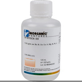 Inorganic Ventures' ICP-MS Calibration Standard 30 is a certified reference material set in a nitric acid matrix for stability. This standard is Traceable to NIST and manufactured in accordance with Inorganic Ventures' stringent Quality Assurance guidelines.