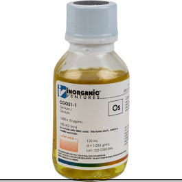 Inorganic Ventures' 1000 ppm (µg/mL) Osmium for ICP is a reference material set in a hydrochloric acid matrix for stability. This osmium standard is Traceable to NIST and manufactured in accordance with Inorganic Ventures' stringent Quality Assurance guidelines.