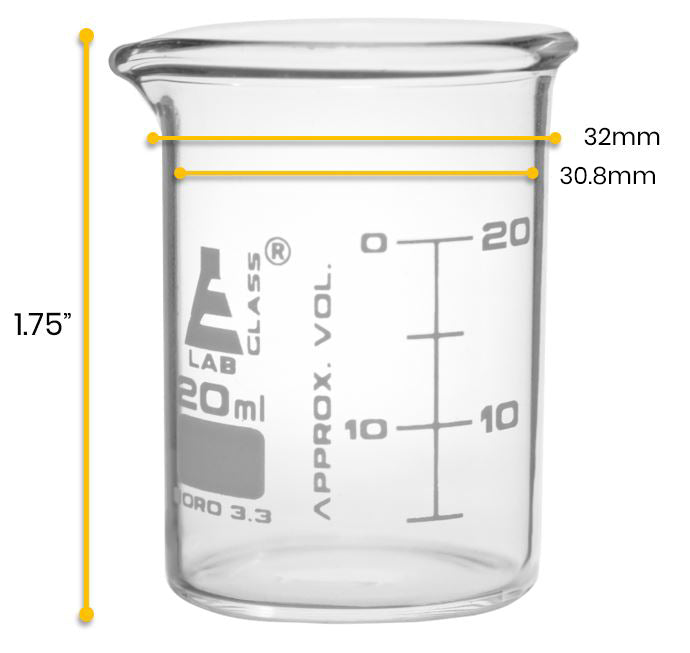 Pack of 12, 20ml capacity, low form beakers made of Borosilicate 3.3 Glass. Each beaker features a dual graduation scale, as per ASTM-E960, with graduation lines every 5ml. Spouts for easy pouring. Uniform walls provide excellent strength against breakage.