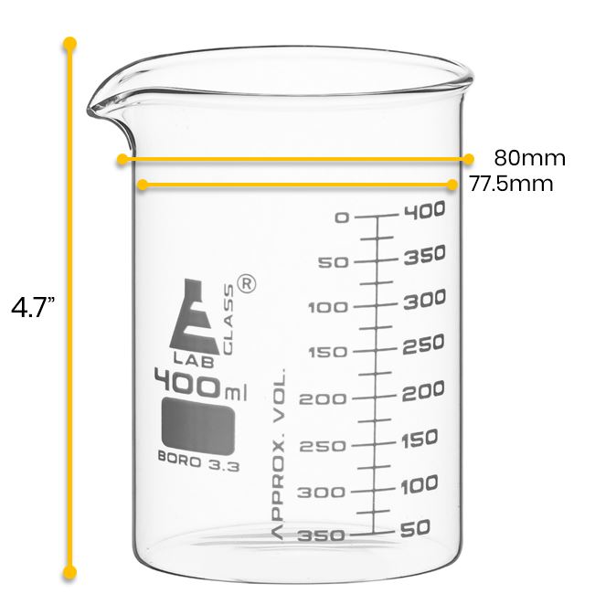 400ml capacity, low form beaker made of Borosilicate 3.3 Glass. Beaker features a dual graduation scale, as per ASTM-E960, with graduation lines every 50ml. Spout for easy pouring. Uniform walls provide excellent strength against breakage.Beaker stands 4.7" tall, and has an inner diameter of 77.5mm and an outer diameter of 80mm.