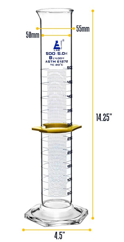 500ml capacity measuring cylinder made of high quality, heavy duty Borosilicate 3.3 glass. Hexagonal base for extra stability. Class B tolerance, ±4.00ml as per ISO/ASTM. Fitted with a plastic, hexagonal protective collar.Cylinder stands 14.25" tall, with a base measuring 4.5" wide. Inner diameter of cylinder body measures 2", and outer diameter measures 2.2".