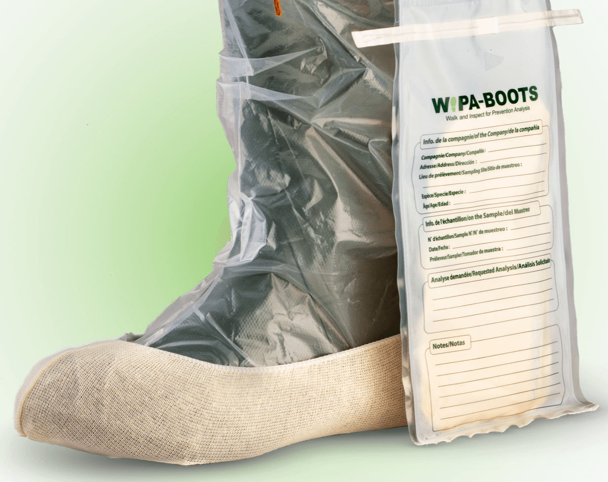 Used to detect pathogens such as viruses (H1N1, African swine fever, PRRS, Cicovirus) and bacteria (Salmonella and E. Coli). Sample collection is done using a pair of pre-moistened cotton boot covers , with Trypton salt which allows the sampling of a large area.