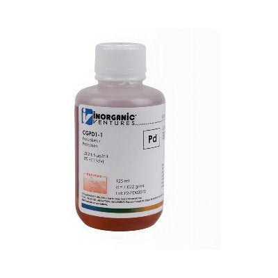 Inorganic Ventures' 1000 ppm (µg/mL) Palladium for ICP is a certified reference material set in a hydrochloric acid matrix for stability. This palladium standard is Traceable to NIST and manufactured in accordance with Inorganic Ventures' stringent Quality Assurance guidelines.