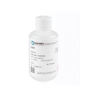 Inorganic Ventures' 1000 ppm (µg/mL) Antimony for ICP is a certified reference material set in a nitric acid / tartaric acid matrix for stability. This antimony standard is Traceable to NIST and manufactured in accordance with Inorganic Ventures' stringent Quality Assurance guidelines.
