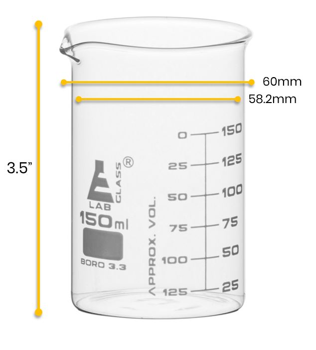 150ml capacity, low form beaker made of Borosilicate 3.3 Glass. Beaker features a dual graduation scale, as per ASTM-E960, with graduation lines every 25ml. Spout for easy pouring. Uniform walls provide excellent strength against breakage.Beaker stands 3.5" tall, and has an inner diameter of 58.2mm and an outer diameter of 60mm.