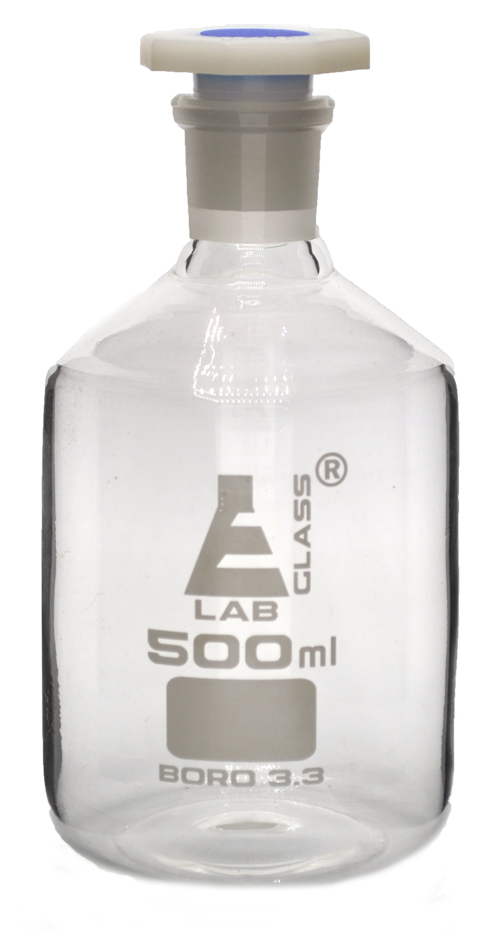 CH0160E | Bottle Reagent, made of borosilicate glass, narrow mouth with acid proof polypropylene stopper 500ml., socket size 24/29