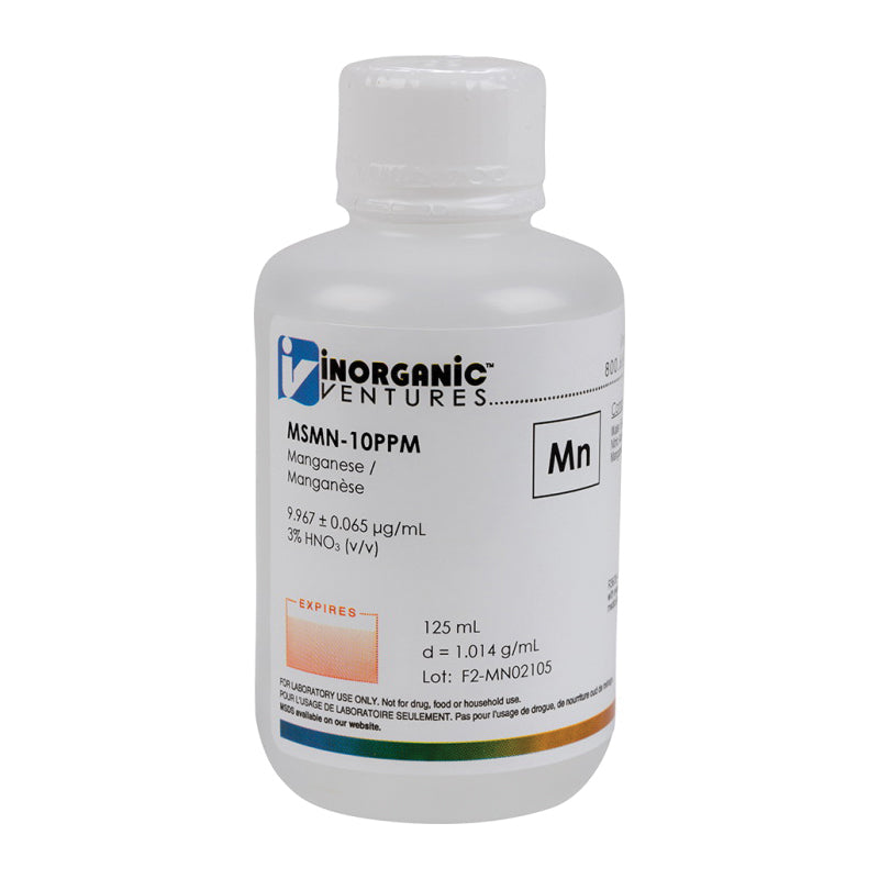 Inorganic Ventures' 10 ppm (µg/mL) Manganese for ICP-MS is a certified reference material set in a nitric acid matrix for stability. This manganese standard is Traceable to NIST and manufactured in accordance with Inorganic Ventures' stringent Quality Assurance guidelines.